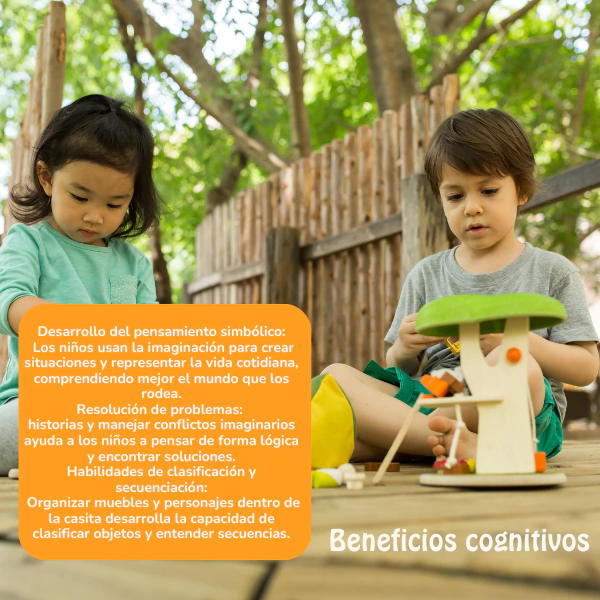 Jugar con casitas de muñecos de madera durante la primera infancia ofrece múltiples beneficios para el desarrollo integral de los niños. Este tipo de juego simbólico es fundamental en los primeros años, ya que promueve habilidades cognitivas, emocionales y sociales clave. Aquí te detallo los principales beneficios: