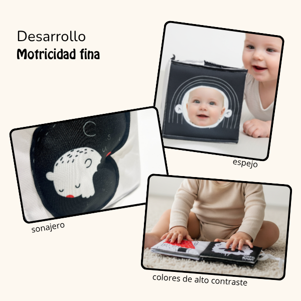 Desarrollo cognitivo: Los libros de contrastes ayudan a que los bebés empiecen a reconocer y distinguir entre diferentes figuras, patrones y objetos. Esta actividad es fundamental para el desarrollo de la memoria visual y la concentración.