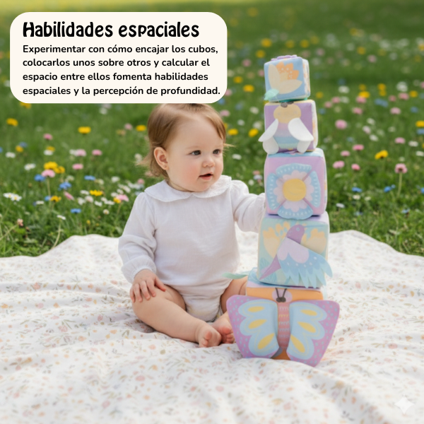 🗺️ Habilidades espaciales: Experimentar con cómo encajar los cubos, colocarlos unos sobre otros y calcular el espacio entre ellos fomenta habilidades espaciales y la percepción de profundidad.