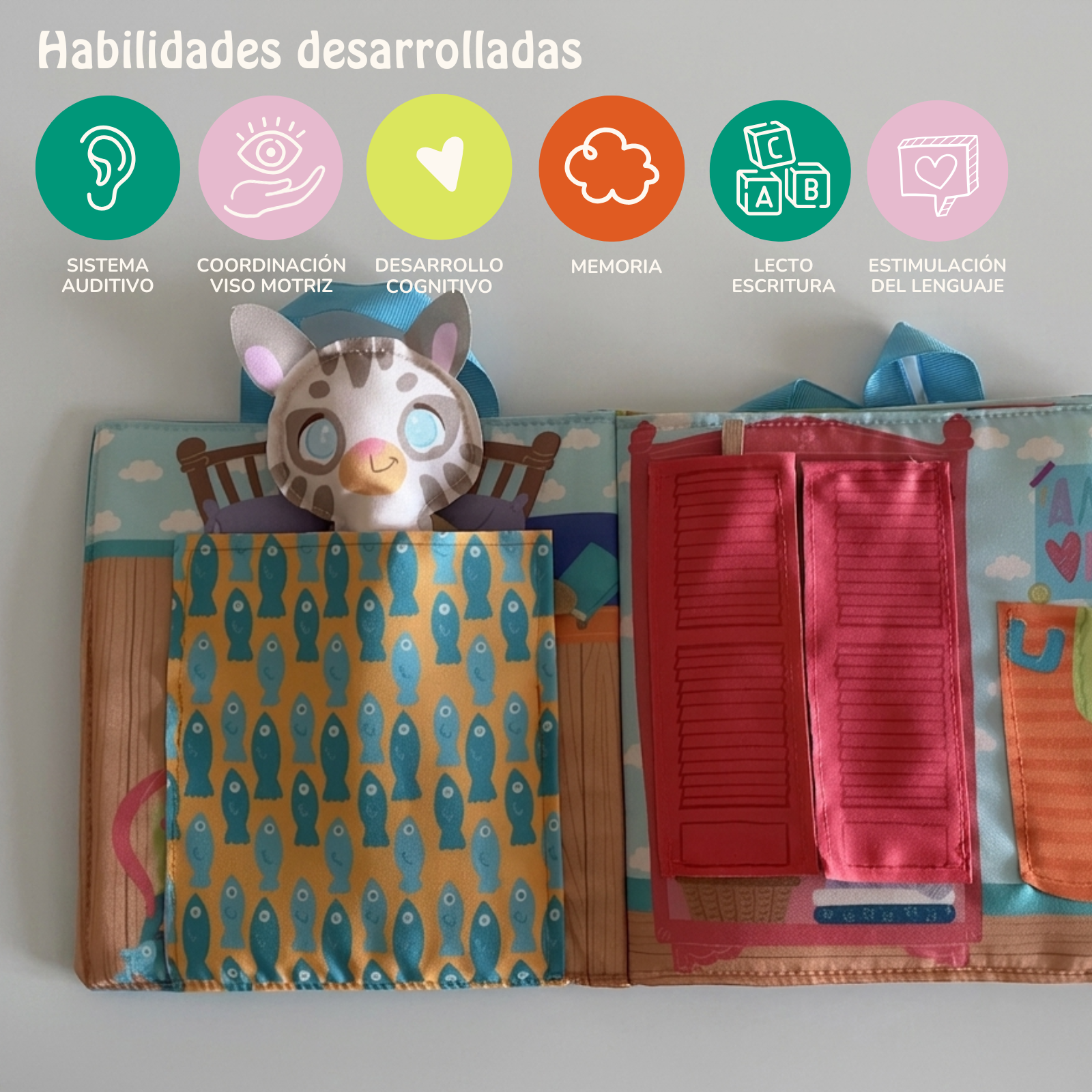 A lo largo de sus páginas, propone desafíos que estimulan la motricidad fina y la coordinación, como usar broches (movimiento de pinza), abrir y cerrar velcros, atar cordones y manipular diferentes elementos.