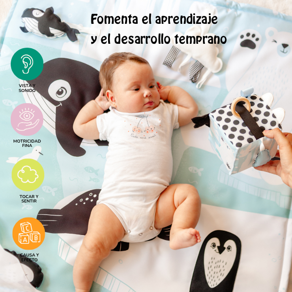 Estimulación visual: Los bebés recién nacidos no pueden ver colores con claridad, por lo que los contrastes fuertes ayudan a captar su atención y les permiten empezar a distinguir formas y patrones más fácilmente.